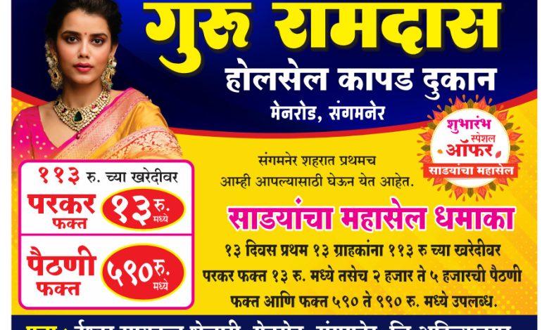 संगमनेर: प्रतिनिधी येत्या महाशिवरात्रीच्या पावन पर्वावर संगमनेरकरांसाठी आनंदाची पर्वणी घेऊन ‘गुरु रामदास होलसेल कापड दुकान’ सज्ज झाले आहे. शहराच्या मुख्य बाजारपेठेत, मेनरोडवर ईश्वर सायकल शेजारी या नवीन दालनाचा शुभारंभ होत असून, त्यानिमित्त आयोजित ‘साड्यांचा महासेल धमाका’ ग्राहकांसाठी आकर्षणाचे केंद्र ठरणार आहे.
